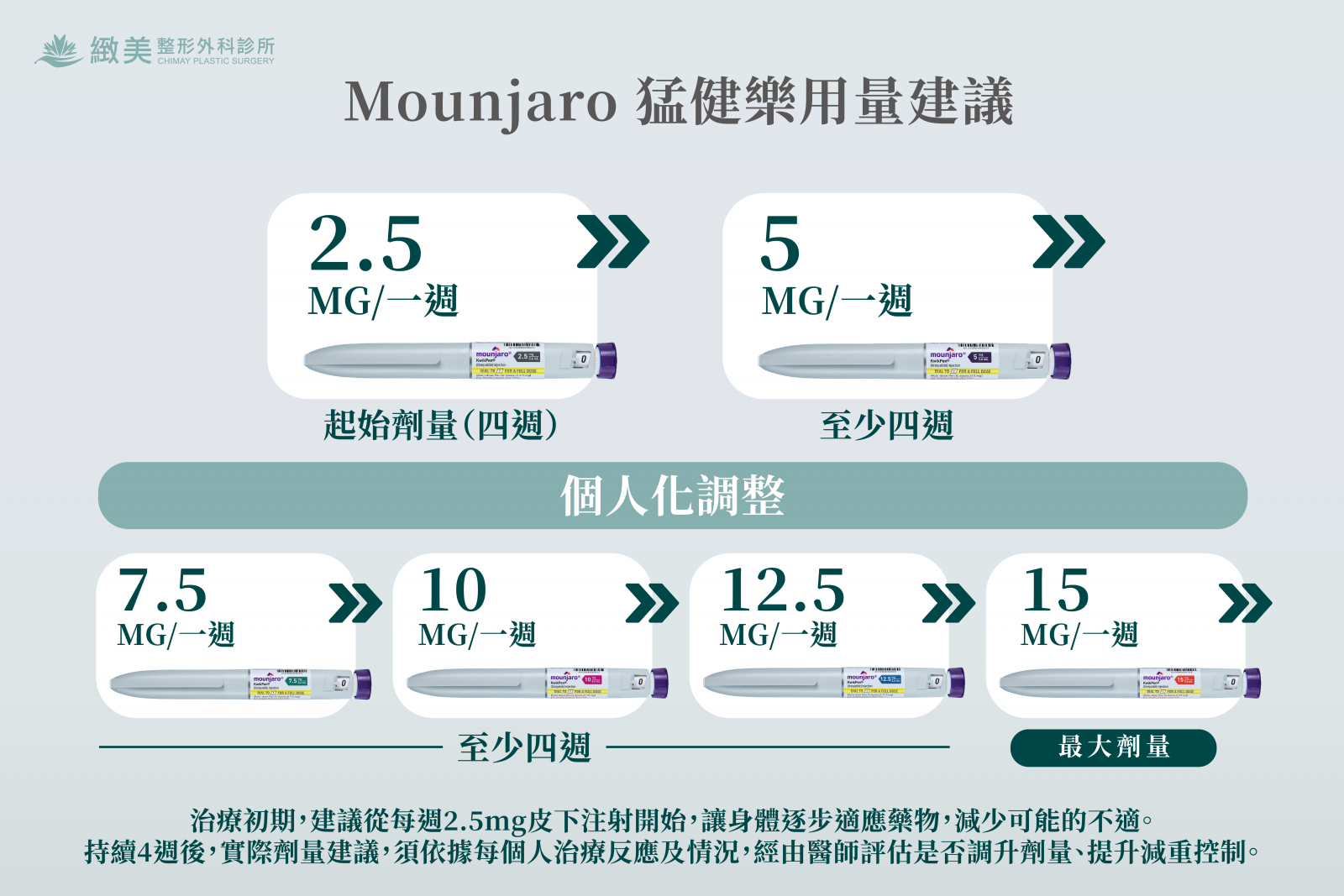 ✦ 治療初期,建議從每週2.5mg皮下注射開始,讓身體逐步適應藥物,減少可能的不適。持續4週後,實際劑量建議,須依據每個人治療反應及情況,經由醫師評估是否調升劑量、提升減重控制。