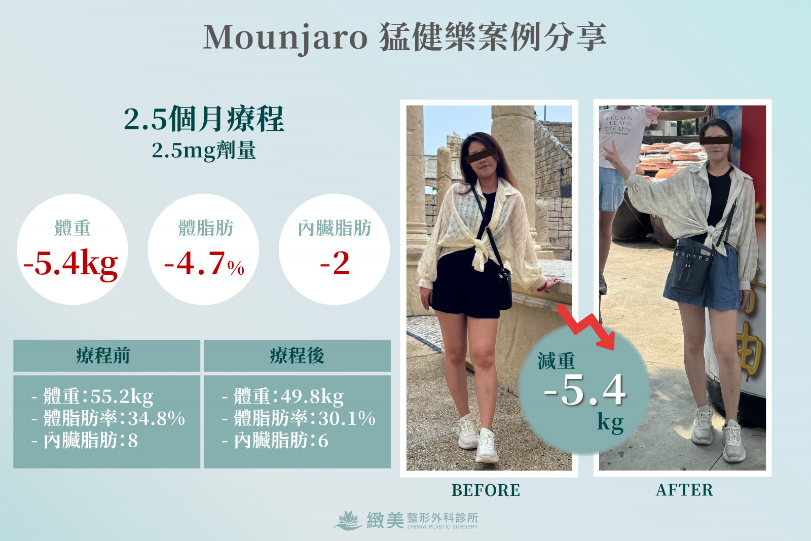 生產過後已經快10年了,但嘗試過各總減重方式都沒有成功,像是吃酵素、燃脂保健品等等,體重依舊維持在高點、也很難忌口來控制飲食,所以後來決定選擇科學的方法,猛健樂。.png) 使用猛健樂的第一週,是完全吃不下,想吃東西的欲望很低,但還是會要自己固定時間吃飯,不過很神奇會選擇原型不油膩的食物。每餐都只能吃原食量的一半就有飽足感,第一週就可以感覺到自己的肚子有消一些,藥效維持到第四、五天之後,才慢慢開始會有飢餓感出來。維持一個月療程之後,體重及體脂數字開始有明顯下降,維持到第二個月之後,體態有越來越明顯的改變,像是後背原本厚厚肉肉的開始感覺到變薄、後腰變細、側腰線也有出來、大腿縫隙出現,雙下巴變小及胸部些微變小。