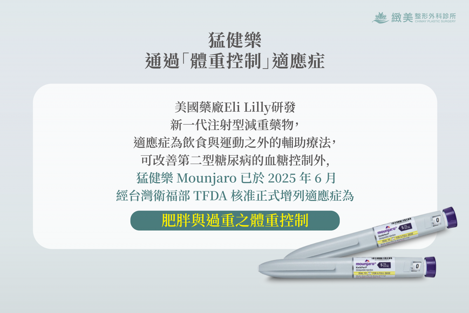 而經台灣衛福部TFDA核准後,正式於2025年上市,並於2025年6月,正式增列猛健樂通過「肥胖與過重之體重控制」為適應症,猛健樂成為台灣合法可用於「體重管理」的注射藥物之一。