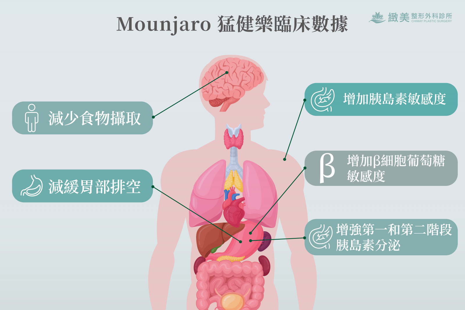 而經台灣衛福部TFDA核准後,正式於2025年上市,並於2025年6月,正式增列猛健樂通過「肥胖與過重之體重控制」為適應症,猛健樂成為台灣合法可用於「體重管理」的注射藥物之一。		              猛健樂減重作用原理是什麼?