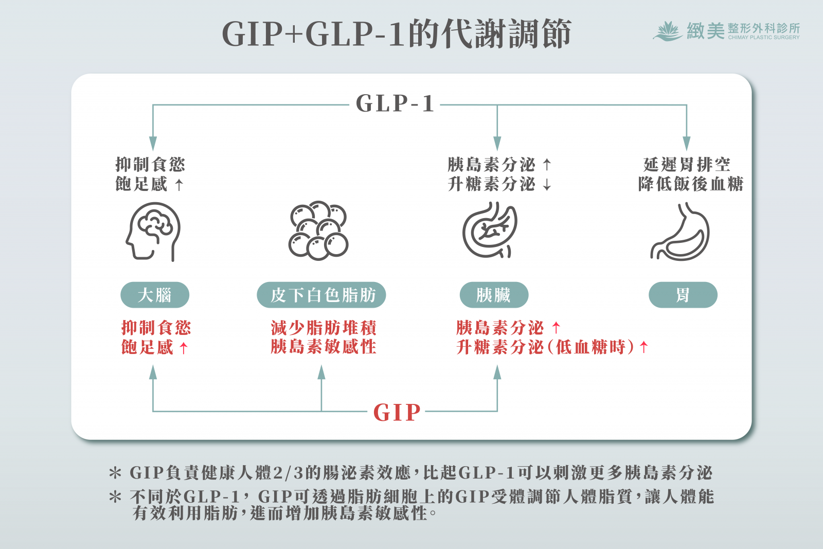 *GIP負責健康人體2/3的腸泌素效應,比起GLP-1可以刺激更多胰島素分泌,透過與人類脂肪細胞結合並活化 GIP 受體,調節人體葡萄糖攝取,並調控脂質攝取和脂肪分解作用,來強加脂肪代謝,促進減重。