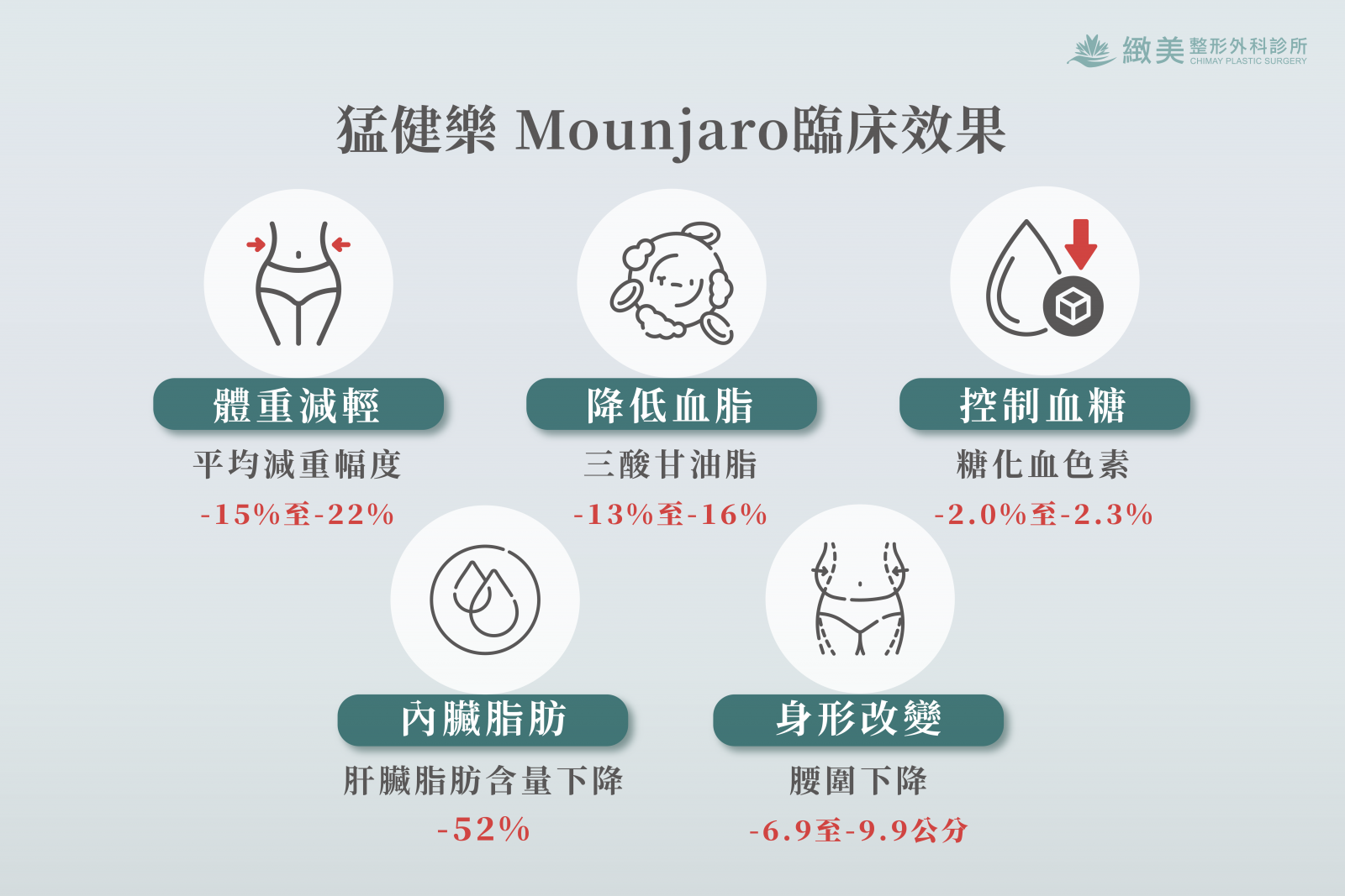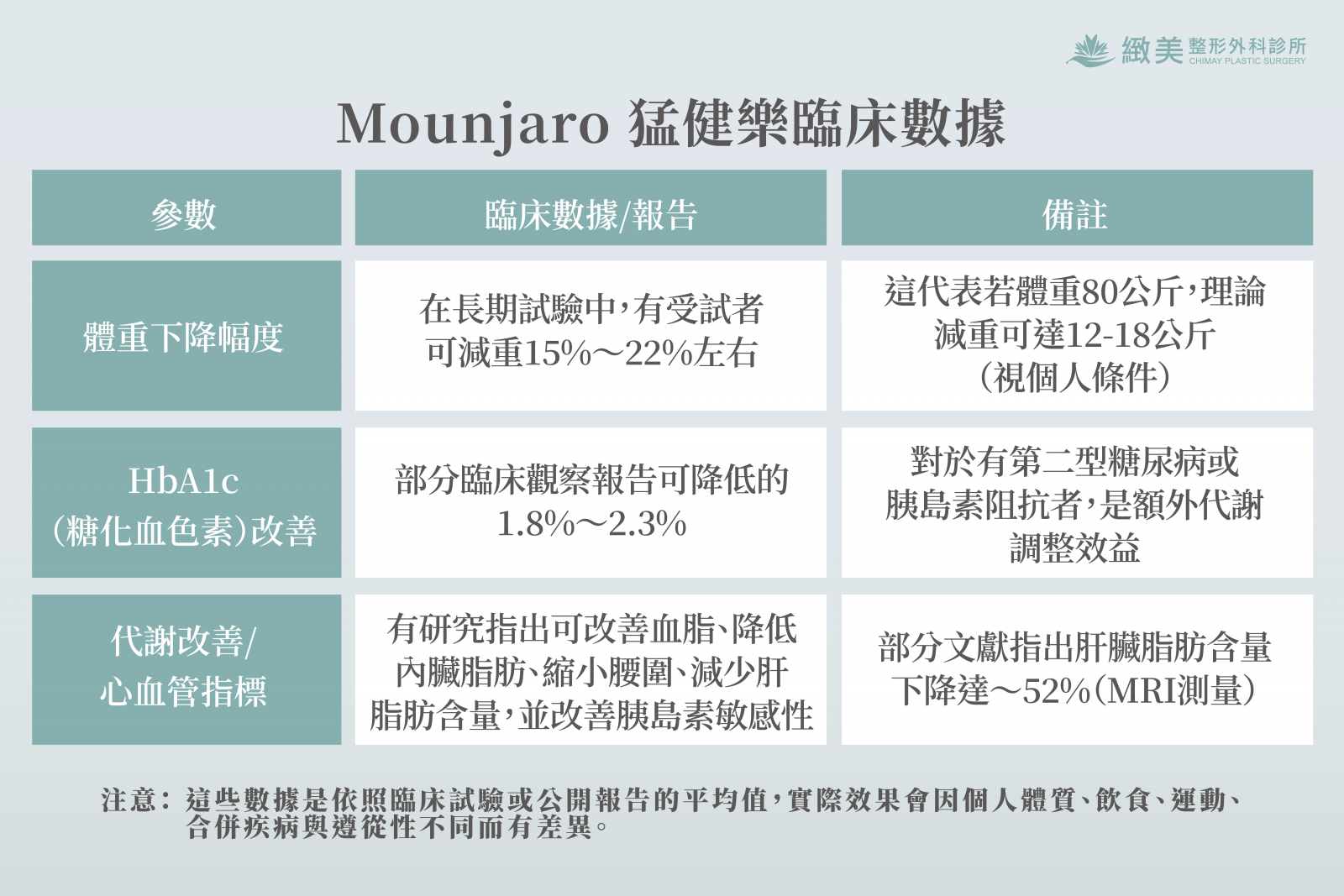 Mounjaro 在臨床試驗中顯示,平均 72 週內可減去 15~22% 體重。相較於傳統減重方法,其透過雙腸泌素機制來延緩胃排空、抑制食慾、促進胰島素分泌,達到控制食量與體重的雙重效果,效果獲得高度肯定。