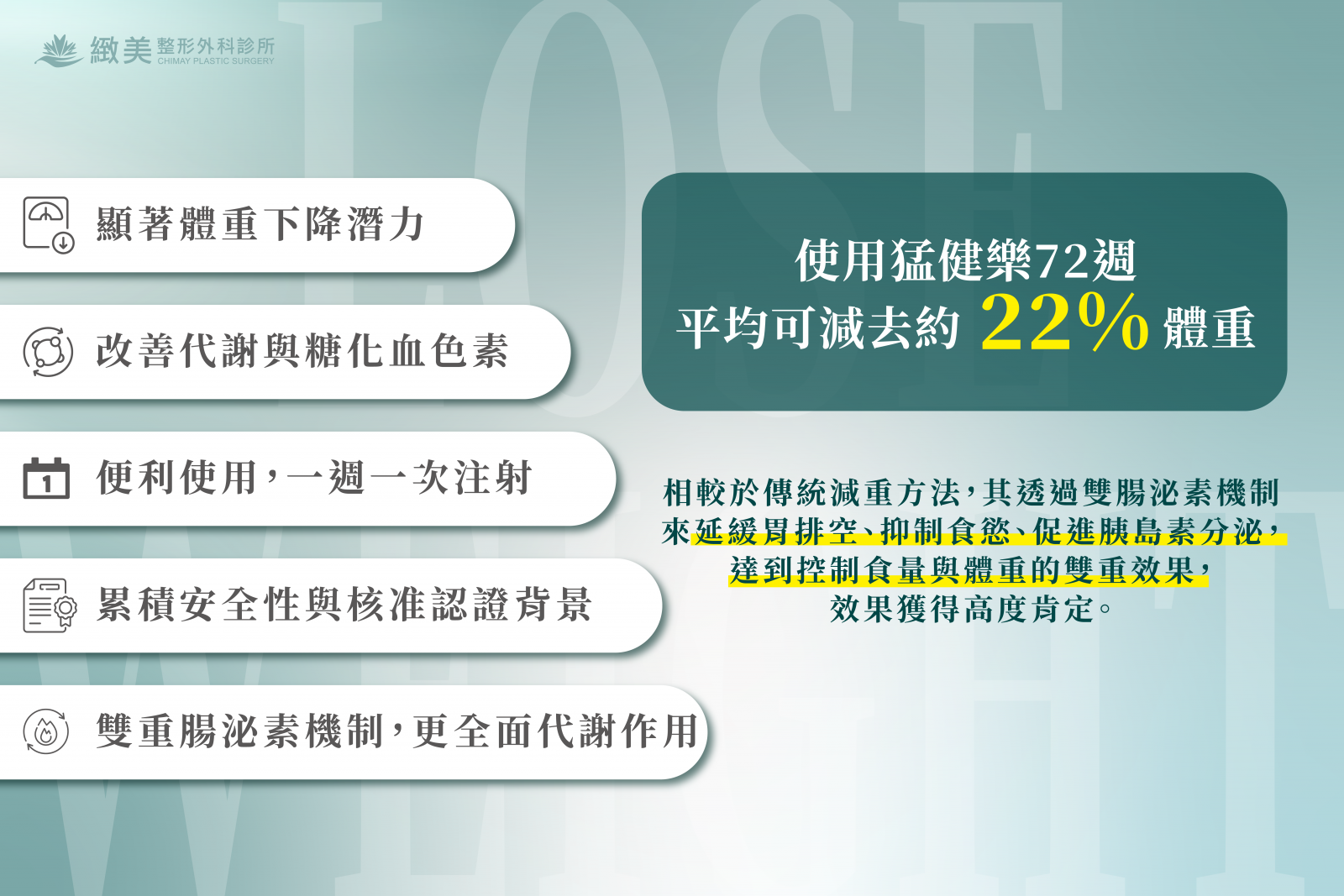 我們的目標 :不只是幫你「變輕變瘦」,更希望透過代謝的調整、行為管理,給予合適的減重治療方案,減重絕對不只是數字下降。猛健樂須由專業醫師評估後才能使用!務必諮詢合法正規的醫療院所。