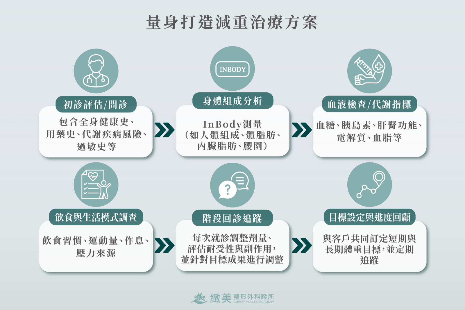 因此在諮詢前,會有血液檢查,這包含到每個人的血糖、胰島素、肝腎功能、電解質、血脂等數值,再來儀器測量,像是緻美提供InBody測量、腰圍數值,最後就是門診問診諮詢,從體內的數值、本身的生活習慣、飲食習慣,客人本身對於減重的目標、體態的期望,綜合下來給予合適的方案,及治療週期。