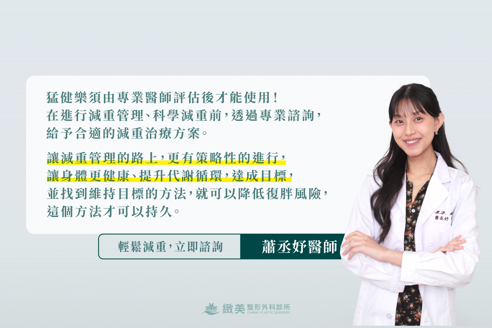 在這個大家都很重視體態管理的世代,科學減重的方式也越來越盛行,因此膳纖達、週纖達的推出,到現在最受大家討論的猛健樂也成為大家的喜愛,但蕭丞妤醫師強調,在進行減重管理、科學減重前,其實還是需要治療前的諮詢評估,由專業醫師的判斷,給予合適的治療方案與劑量。