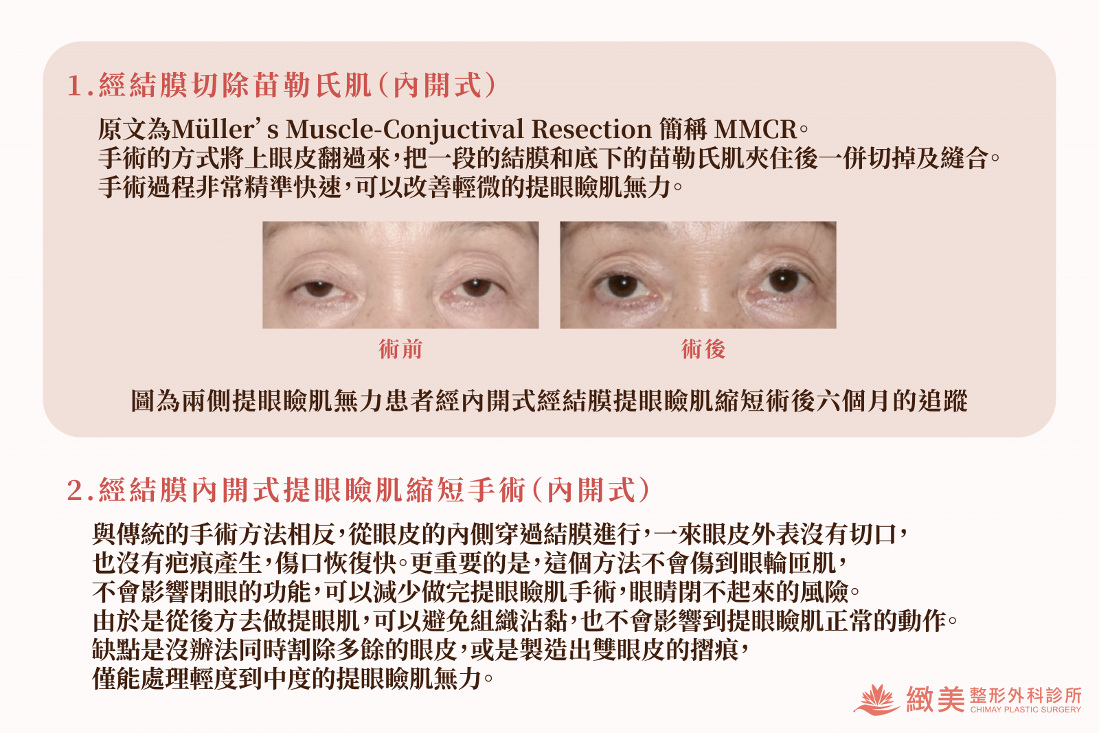 與傳統的手術方法相反,從眼皮的內側穿過結膜進行,一來眼皮外表沒有切口,也沒有疤痕產生,傷口恢復快。更重要的是,這個方法不會傷到眼輪匝肌,不會影響閉眼的功能,可以減少做完提眼瞼肌手術,眼睛閉不起來的風險。由於是從後方去做提眼肌,可以避免組織沾黏,也不會影響到提眼瞼肌正常的動作。缺點是沒辦法同時割除多餘的眼皮,或是製造出雙眼皮的摺痕,僅能處理輕度到中度的提眼瞼肌無力。