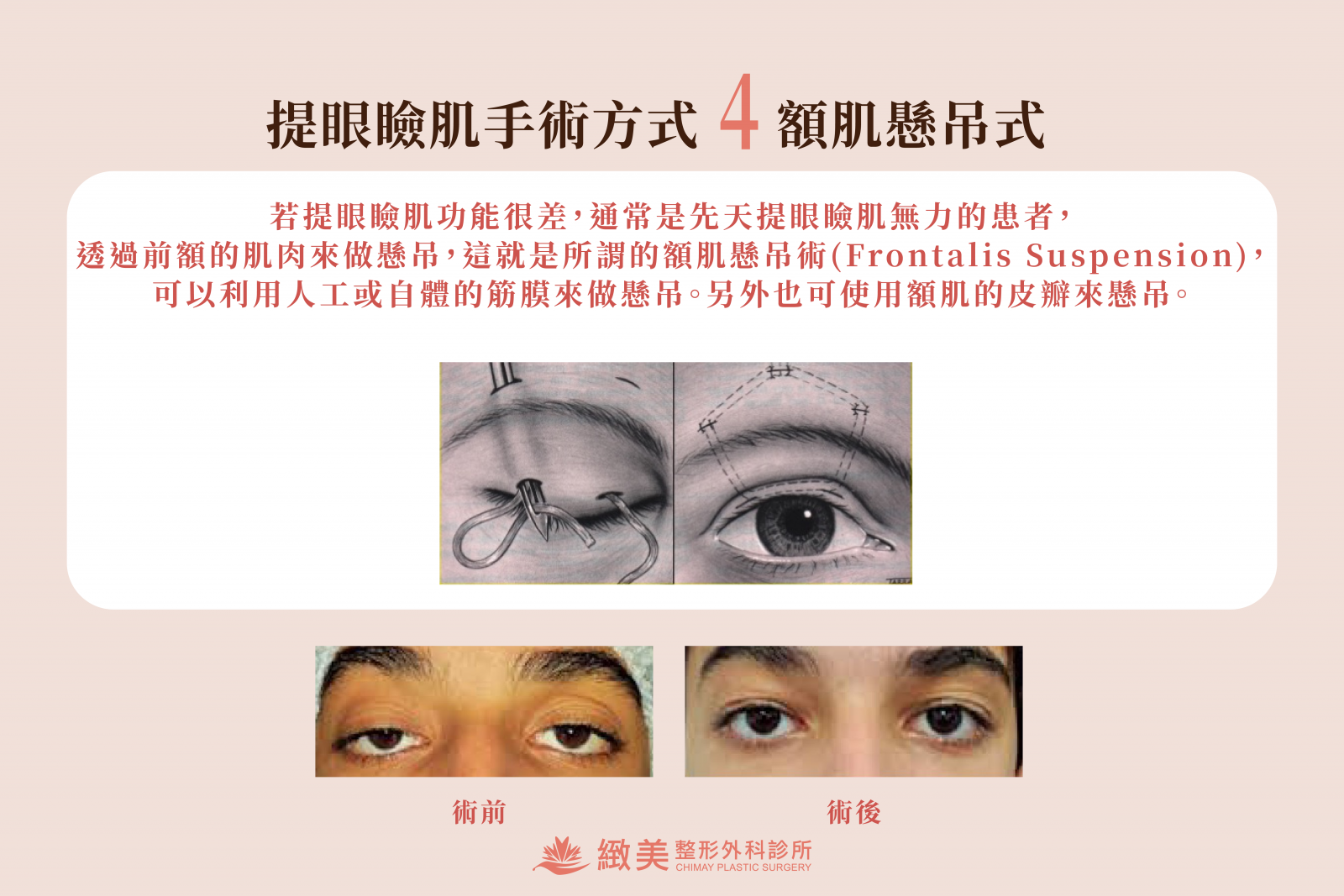 如果提眼瞼肌功能很差,通常是先天提眼瞼肌無力的病患,這時候提眼瞼肌本身就不能再利用,而要利用前額的肌肉來做懸吊,這就是所謂的額肌懸吊術(Frontalis Suspension),可以利用人工的筋摩或自體的筋膜來做懸吊。另外也有人使用額肌的皮瓣來懸吊。手術的缺點是有可能會造成閉眼不全,不自然的張眼,前額凹陷;前額皺紋消失,眉毛不對稱及傷害到顏面神經的前額分支等等。 內開12點迴旋提眼瞼肌手術