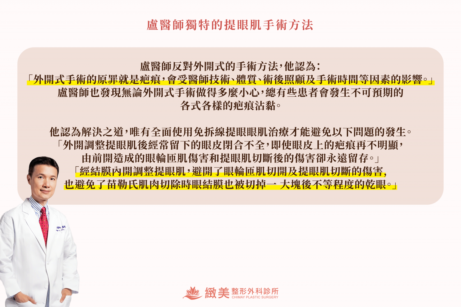 盧醫師反對外開式的手術方法,他認為:「外開式手術的原罪就是疤痕,會受醫師技術,體質,術後照顧及手術時間等因素的影響,變數太多,難以控制。」盧醫師也發現無論外開式手術做得多麼小心,總有些患者會發生不可預期的各式各樣的疤痕沾黏。他認為解決之道唯有全面使用免拆線提眼眼肌治療才能避免以下問題的發生。