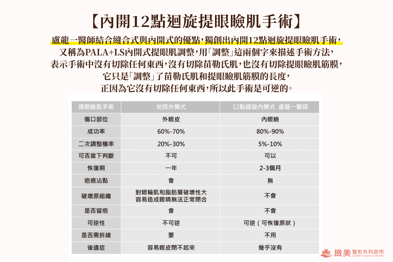 【內開12點迴旋提眼瞼肌手術】並非我們前面提到的「經結膜切除苗勒氏肌」(MMCR) 如此簡單,也不需「經結膜內開式提眼瞼肌縮短手術」那麼麻煩,盧龍一醫師結合縫合式與內開式的優點,獨創出內開12點迴旋提眼瞼肌手術,又稱為PALA+LS內開式題眼肌調整,用「調整」這兩個字來描述手術方法其實是另有深意的,表示手術中沒有切除任何東西,沒有切除苗勒氏肌,也沒有切除提眼瞼肌筋膜,它只是「調整」了苗勒氏肌和提眼瞼肌筋膜的長度,正因為它沒有切除任何東西,所以此手術是可逆的。