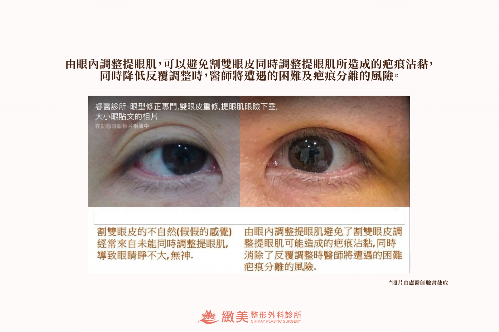 「經結膜內開調整提眼肌避開了眼輪匝肌切開及提眼肌切斷的傷害, 也避免了苗勒氏肌肉切除時眼結膜也被切掉一 大塊後不等程度的乾眼。」