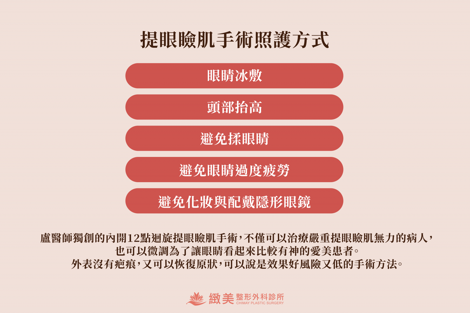 發現自己有提眼瞼肌無力的症狀,就應該要及早處理,減緩眼瞼肌的耗損,也減少抬頭紋產生,別讓無神的雙眼及老態的外表一直糾纏你。盧龍一醫師做提眼瞼肌手術,是採用內開隱痕的方式,所以傷口小,恢復期約一週時間,不但可以改善顯老的外表,還能一併拉提鬆垮肌膚;需要注意的是,提眼瞼肌手術比較複雜,記得要找對眼部構造熟悉的醫師,才能做精準的判斷,降低風險。