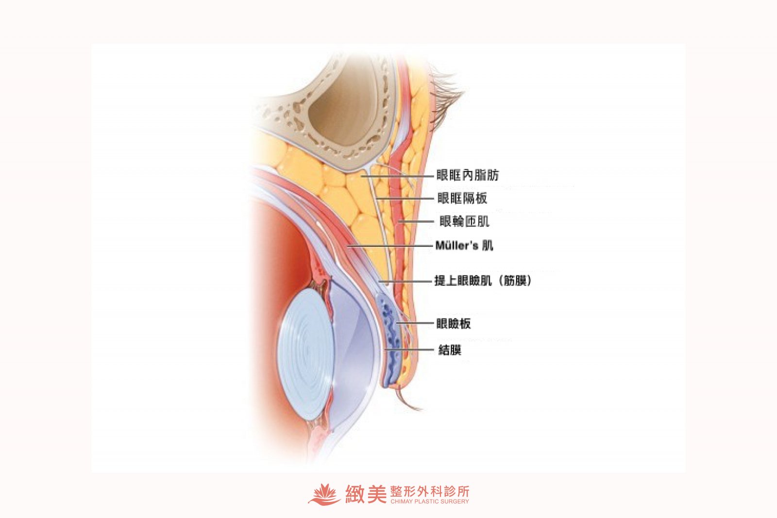 上眼皮的構造:如圖,提上眼瞼肌和苗勒氏肌(Müller’s muscle)協同,就像是上下捲動的窗簾一樣,負責拉起我們的上眼皮,讓眼睛可以張開,而眼輪匝肌則負責相反的動作,讓我們的眼睛閉起來,我們眼睛每天平均要眨眼11520次,以保護眼睛的功能正常,也就是這些肌肉每天要工作這麼多次,所以可以想像它們是非常的辛苦,而當提眼瞼肌出問題的時候,就會造成上眼皮開啟的功能受到阻礙,也就是以下要討論的眼瞼下垂,或稱為提眼瞼肌無力。