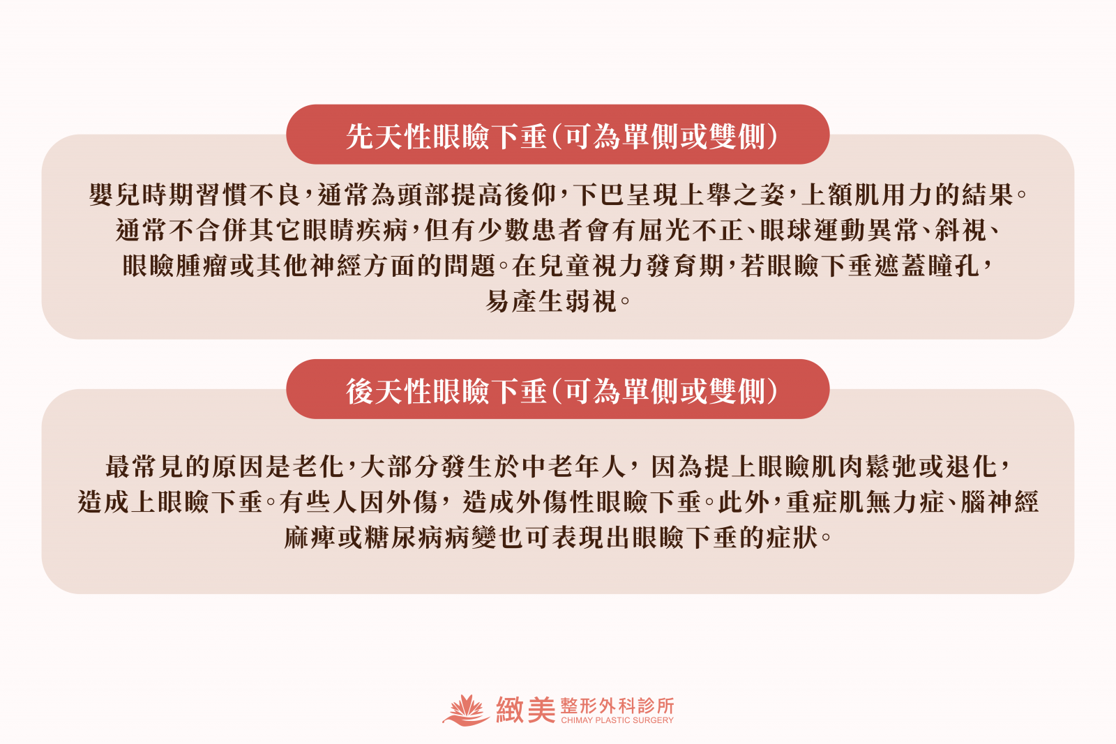 最常見的原因是老化,大部分發生於中老年人, 因為提上眼瞼肌肉鬆弛或退化,造成上眼瞼下垂。有些人因外傷, 造成外傷性眼瞼下垂。此外,重症肌無力症、腦神經麻痺或糖尿病病變也可表現出眼瞼下垂的症狀。