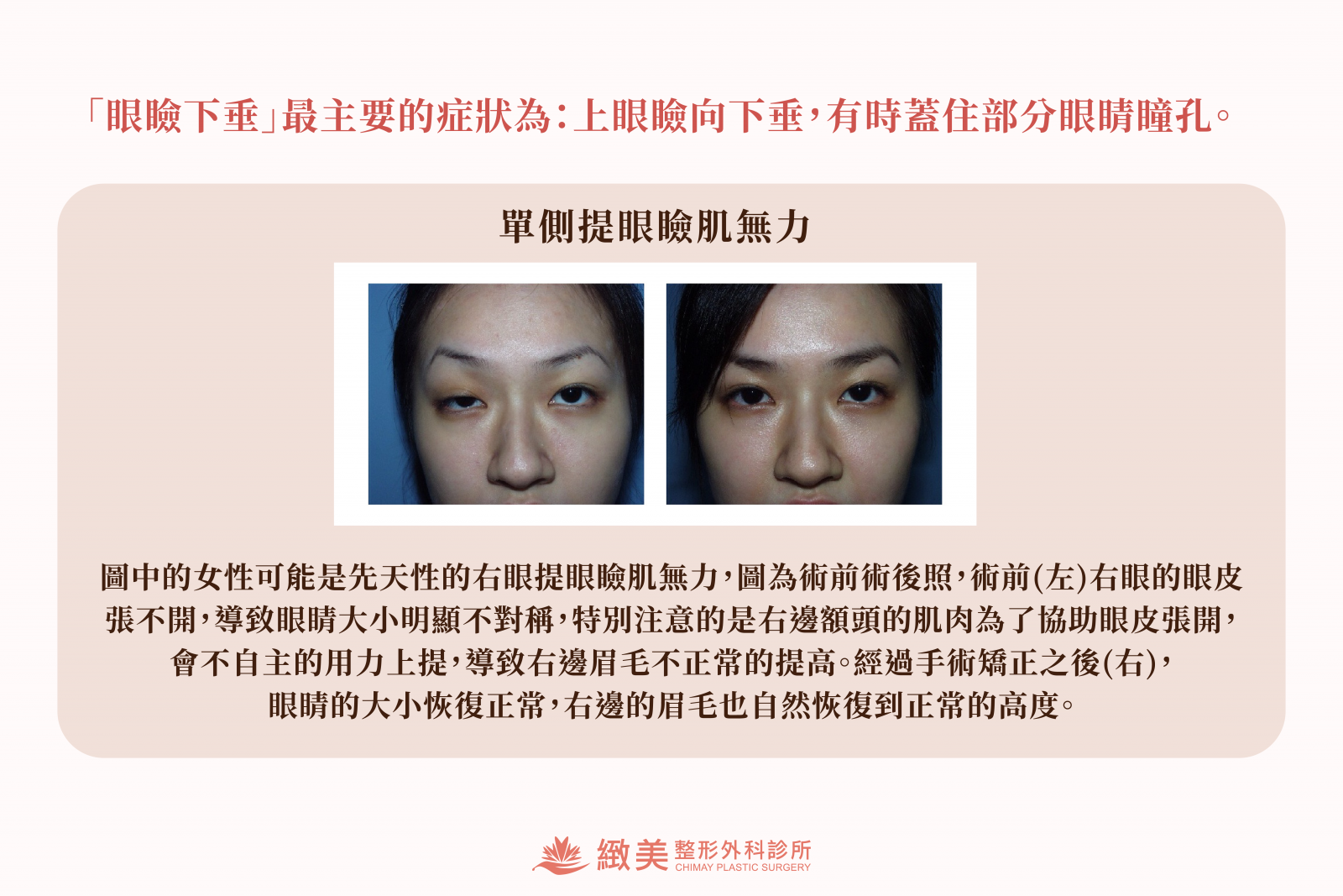 圖中的女性可能是先天性的右眼提眼瞼肌無力,圖為術前術後照,術前(左)右眼的眼皮張不開,導致眼睛大小明顯不對稱,特別注意的是右邊額頭的肌肉為了協助眼皮張開,會不自主的用力上提,導致右邊眉毛不正常的提高。經過手術矯正之後(右),眼睛的大小恢復正常,右邊的眉毛也自然恢復到正常的高度。