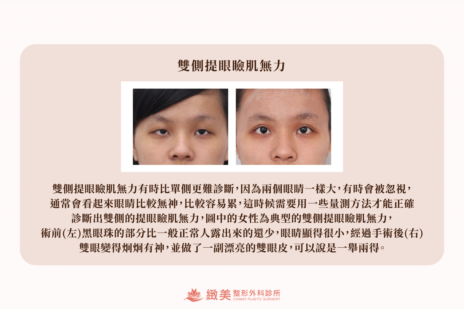 雙側提眼瞼肌無力有時比單側更難診斷,因為兩個眼睛一樣大,有時會被忽視,通常會看起來眼睛比較無神,比較容易累,這時候需要用一些量測方法才能正確診斷出雙側的提眼瞼肌無力,圖中的女性為典型的雙側提眼瞼肌無力,術前(左)黑眼珠的部分比一般正常人露出來的還少,眼睛顯得很小,經過手術後(右)雙眼變得炯炯有神,並做了一副漂亮的雙眼皮,可以說是一舉兩得。
