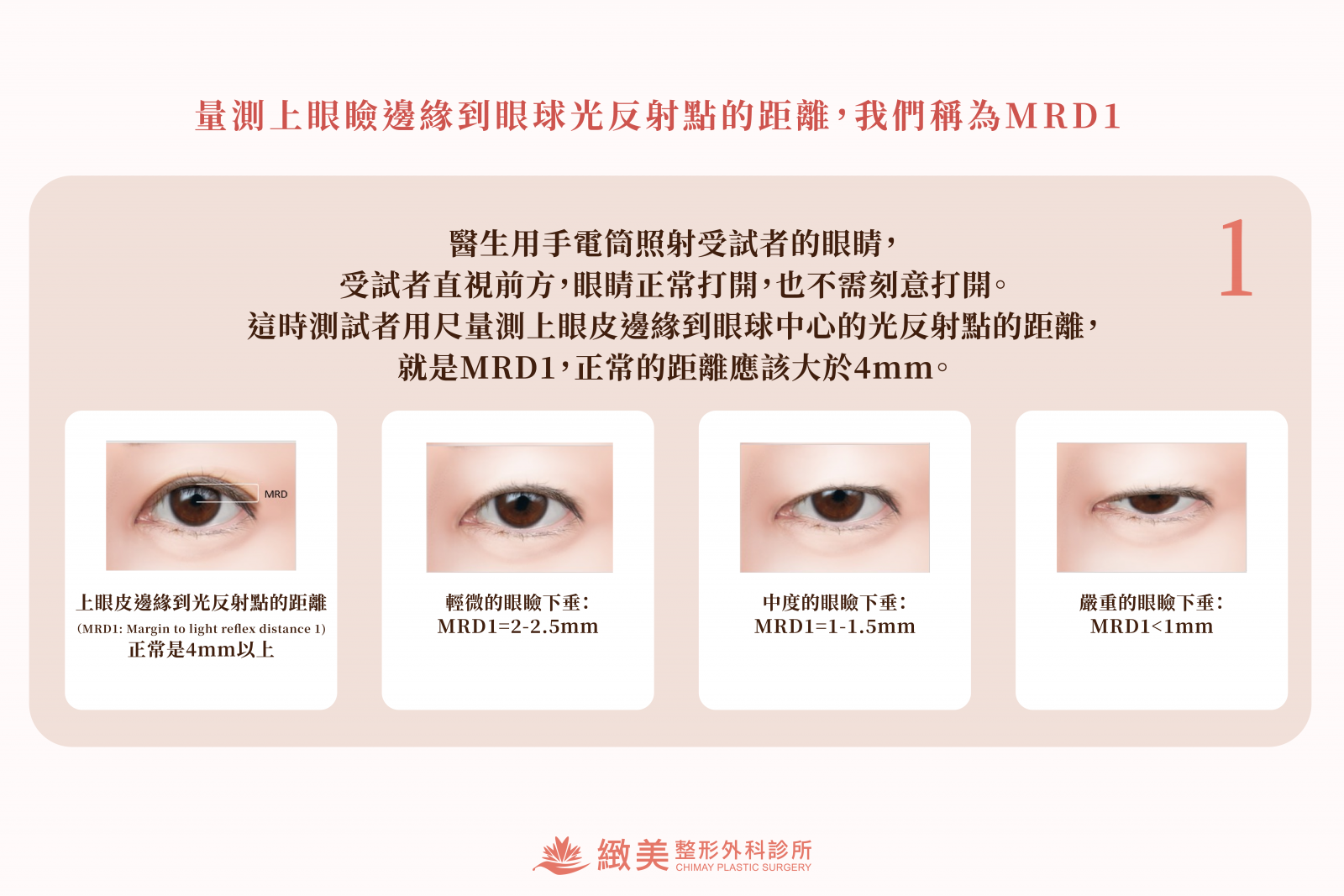醫生用手電筒照射受試者的眼睛,受試者直視前方,眼睛正常打開,也不需刻意力打開。這時測試者用尺量測上眼皮邊緣到眼球中心的光反射點的距離,就是MRD1,正常的距離應該大於4mm。