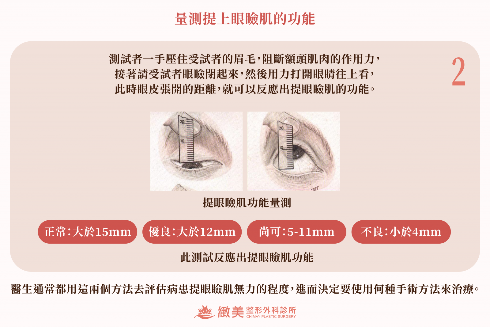 測試者一手壓住受試者的眉毛,阻斷額頭肌肉的作用力,然後請受試者眼瞼閉起來,然後用力打開眼睛往上看,這時候眼皮張開的距離,就可以反應出提眼瞼肌的功能。