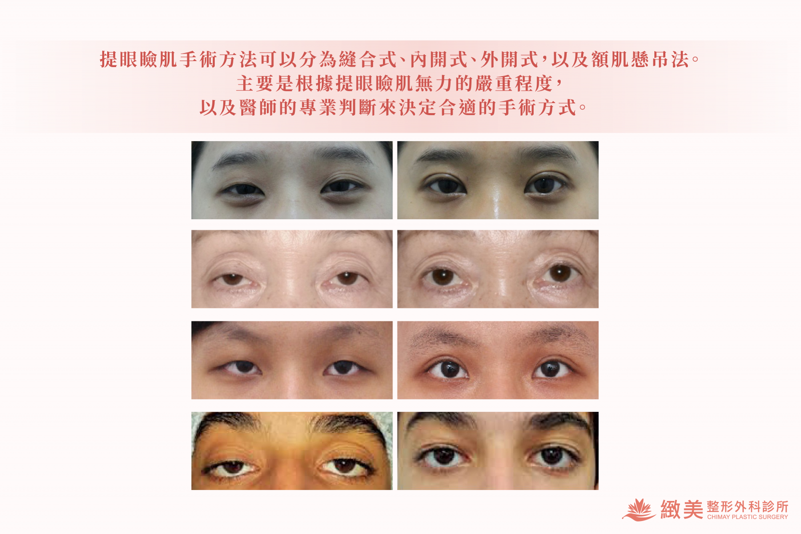提眼瞼肌手術方法可以分為縫合式、內開式、外開式,以及額肌懸吊法。至於選擇哪一種術式,主要是根據提眼瞼肌無力的嚴重程度,以及醫師的專業判斷來決定合適的手術方式。