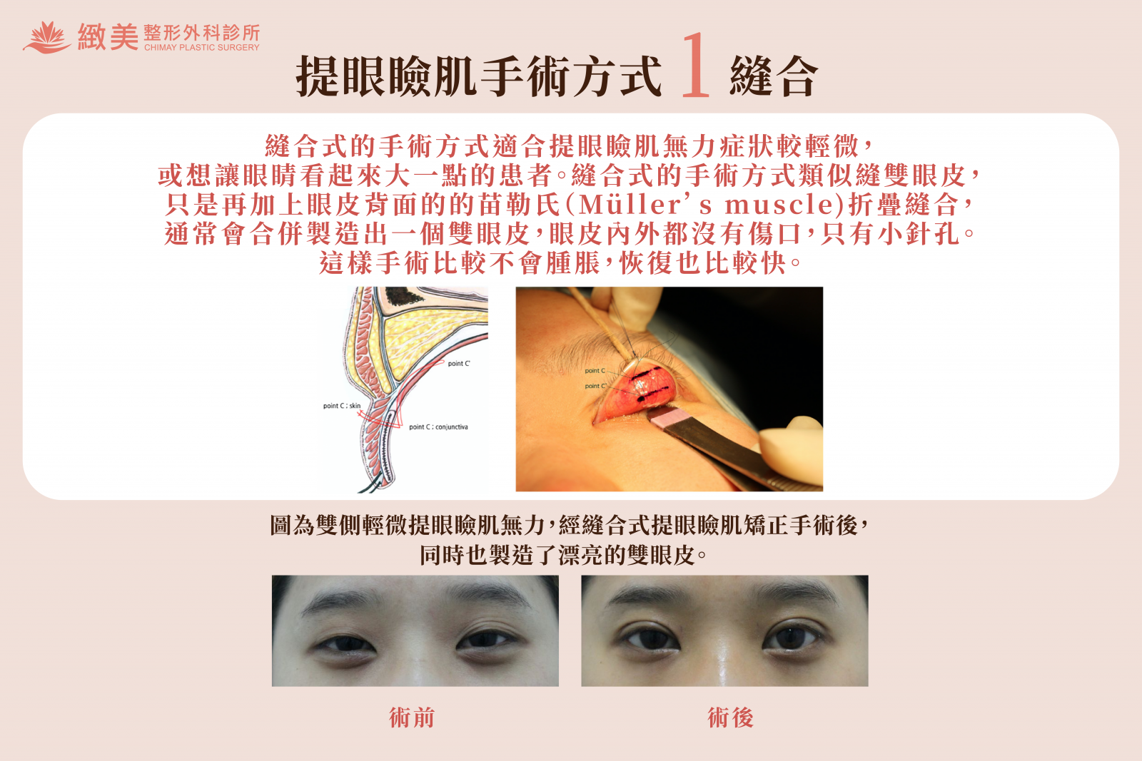 縫合式的手術方式類似縫雙眼皮,只是再加上眼皮背面的的苗勒氏(Müller’s muscle)折疊縫合,通常會合併製造出一個雙眼皮,眼皮內外都沒有傷口,只有小針孔。這樣手術比較不會腫脹,恢復也比較快。圖為雙側輕微提眼瞼肌無力,經縫合式提眼瞼肌矯正手術後,同時也製造了漂亮的雙眼皮。