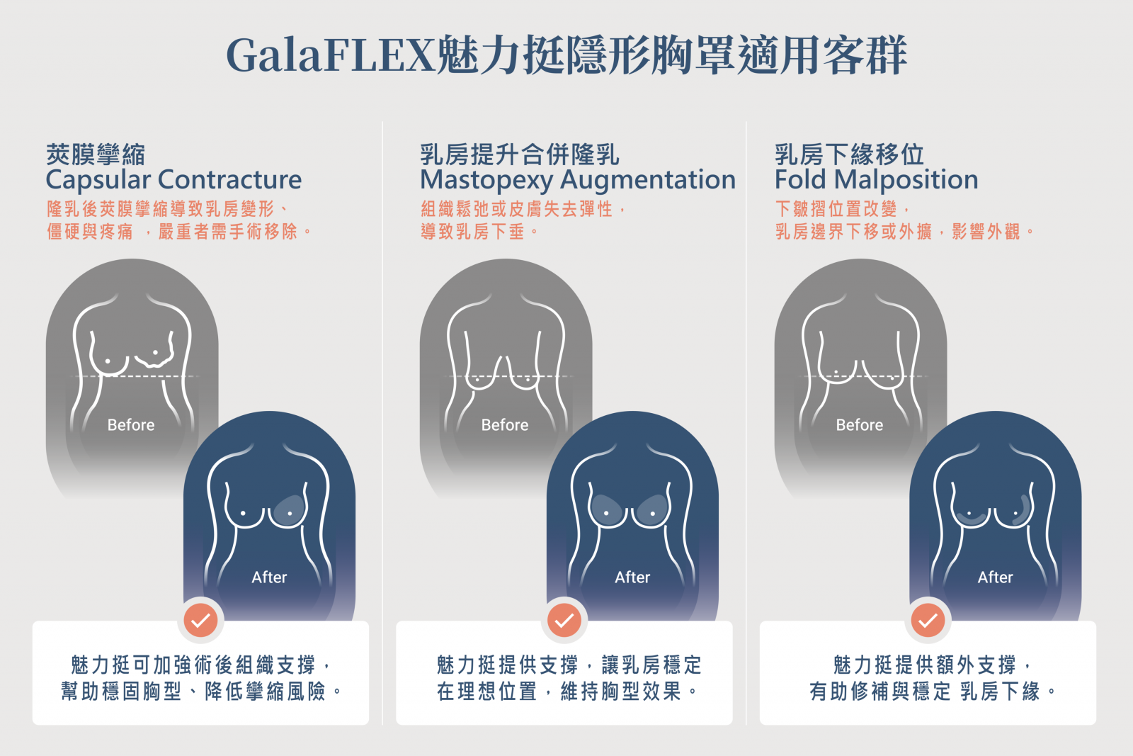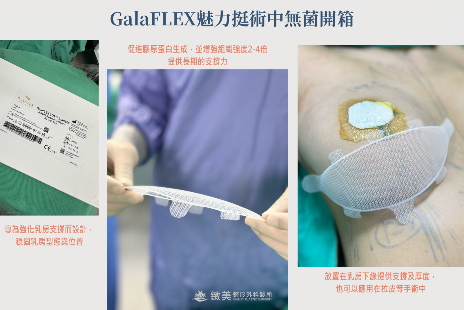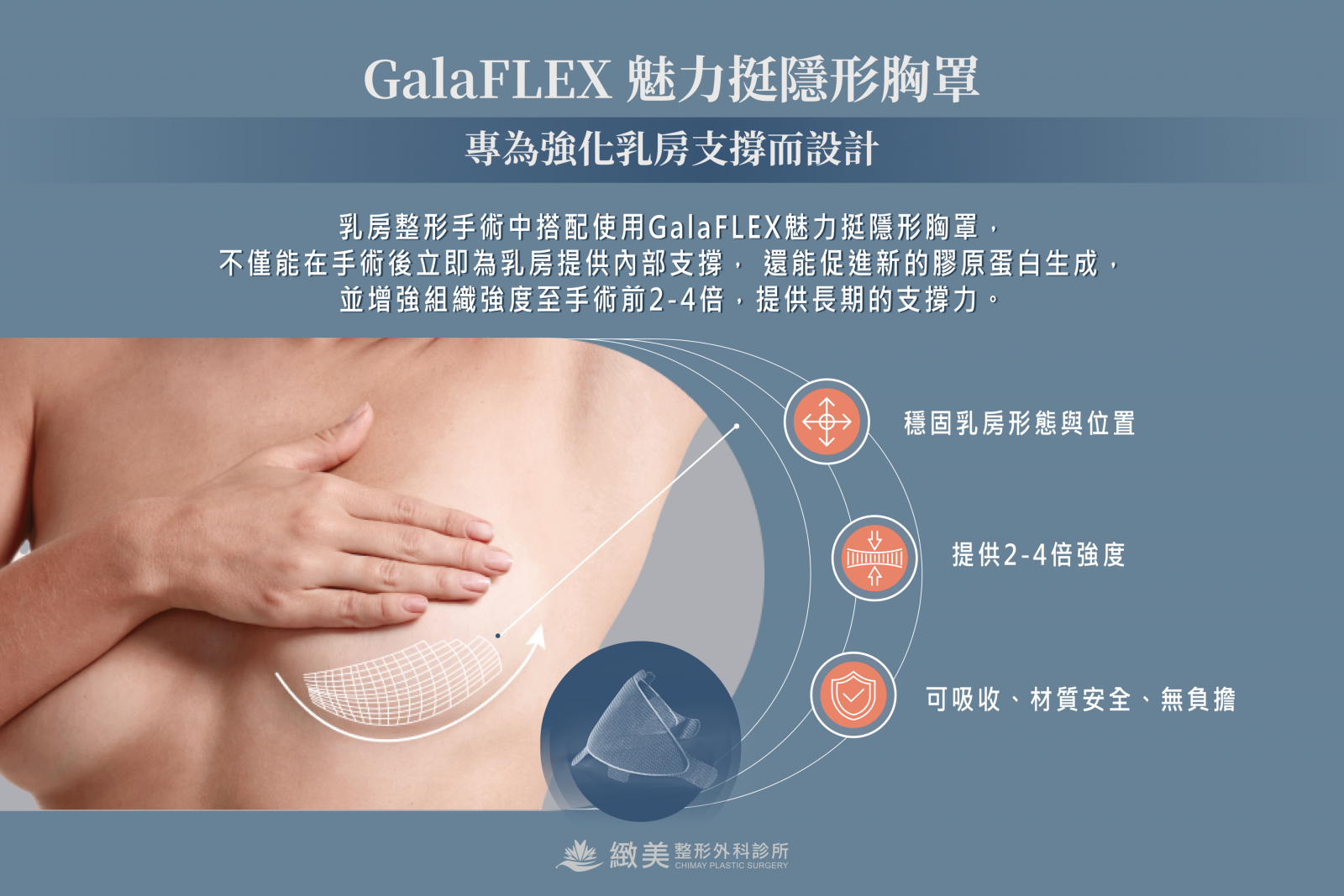 GalaFLEX魅力挺可作為乳房整形手術的輔助支撐材料,有助於維持術後乳房形態與位置,延續手術成果。