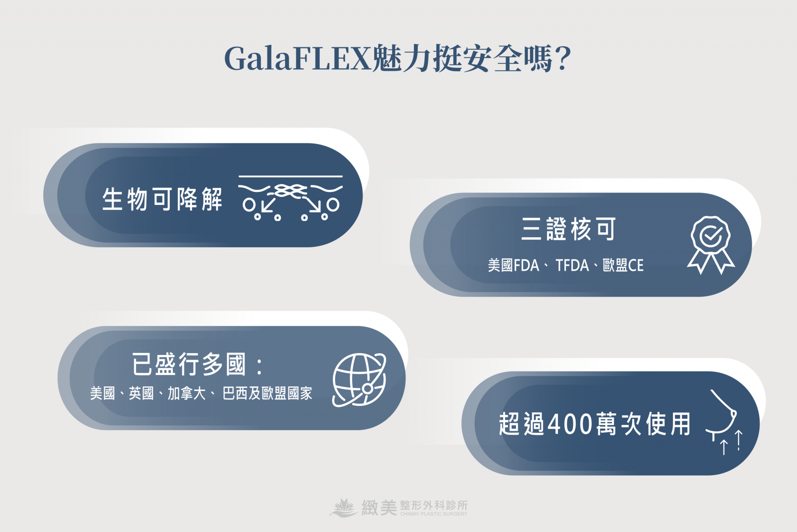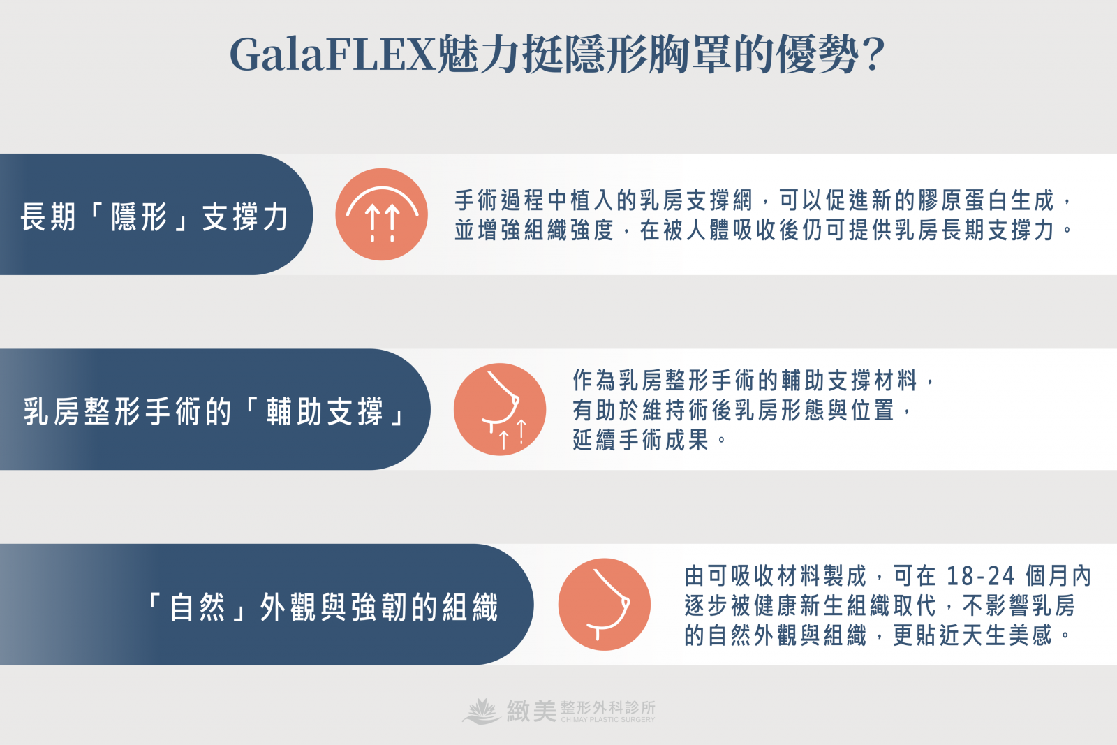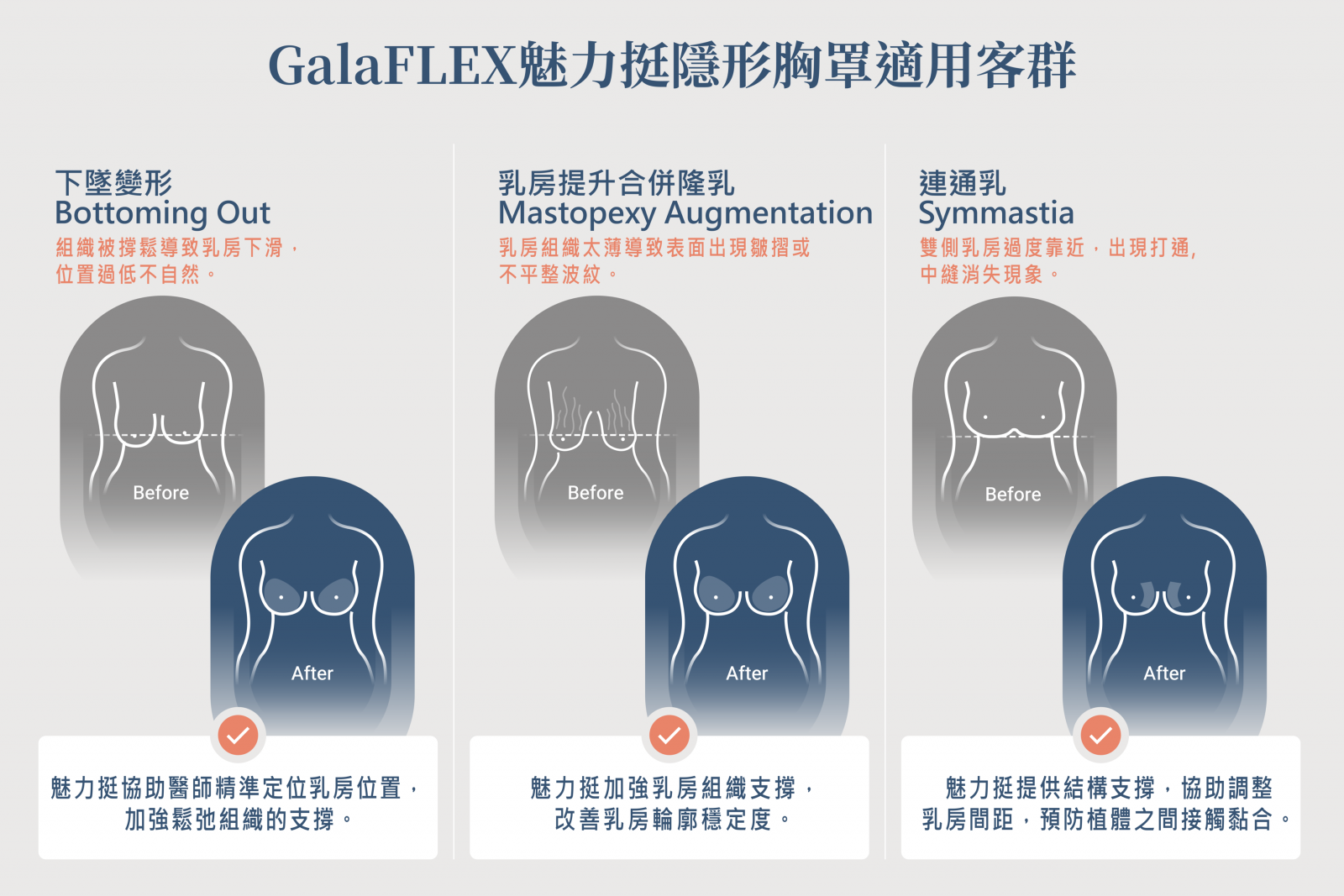 GalaFLEX魅力挺可作為乳房整形手術的輔助支撐材料,有助於維持術後乳房形態與位置,延續手術成果。