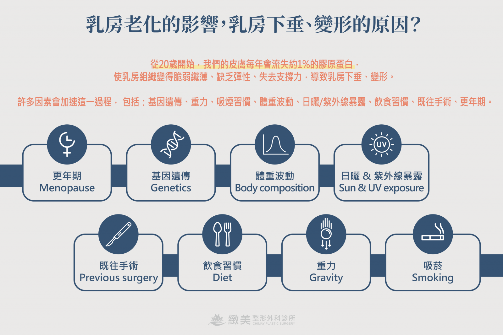 隨著年齡增長,皮膚也會逐漸老化。從20歲開始,我們的皮膚每年會流失約1%的膠原蛋白,使乳房組織變得脆弱纖薄、缺乏彈性、失去支撐力,導致乳房下垂、變形。許多因素會加速這一過程,包括:基因遺傳、重力、吸煙習慣、體重波動、日曬/紫外線暴露、飲食習慣、既往手術、更年期。