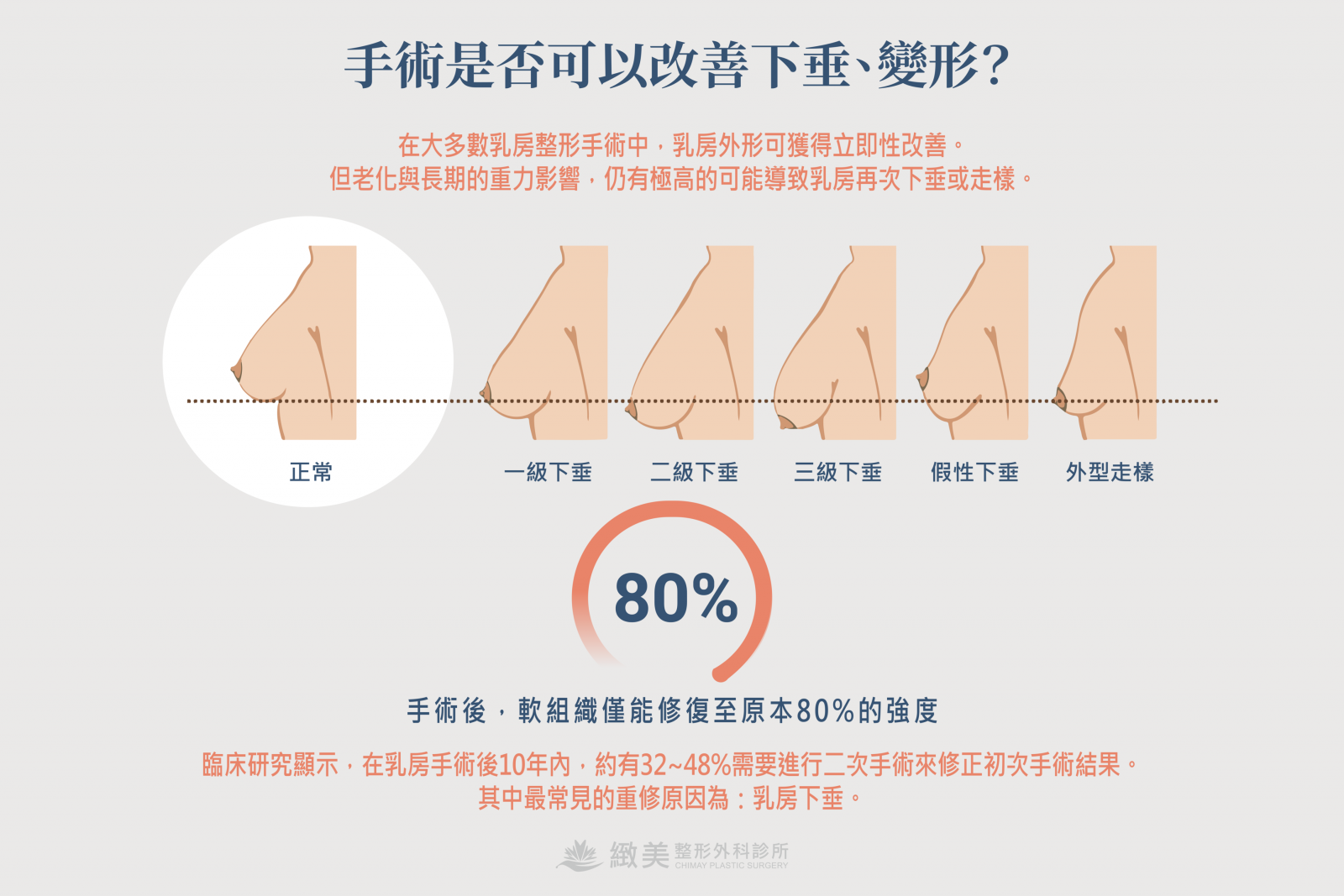 而手術後,軟組織僅能修復至原本80%的強度。臨床研究顯示,在乳房手術後10年內,約有32~48%的患者需要進行二次手術來修正初次手術結果。其中最常見的重修原因為:乳房下垂。