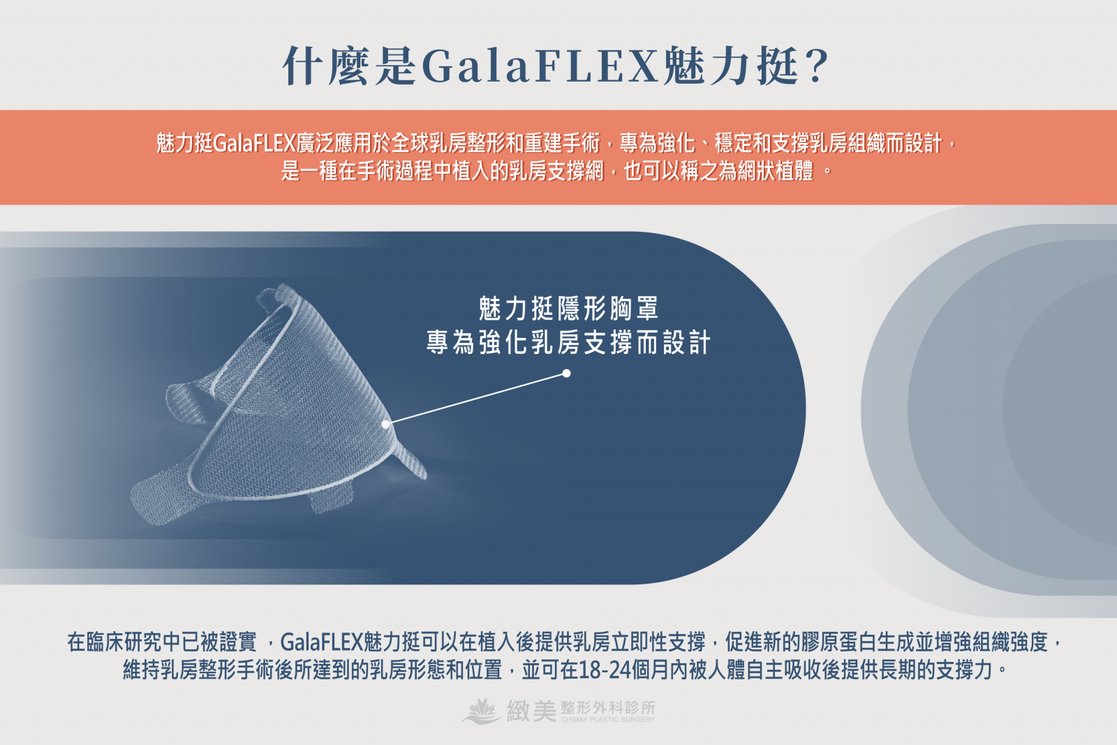 GalaFLEX魅力挺是一種在手術過程中植入的乳房支撐網,可以促進新的膠原蛋白生成,並增強組織強度,在被人體吸收後仍可提供乳房長期支撐力。