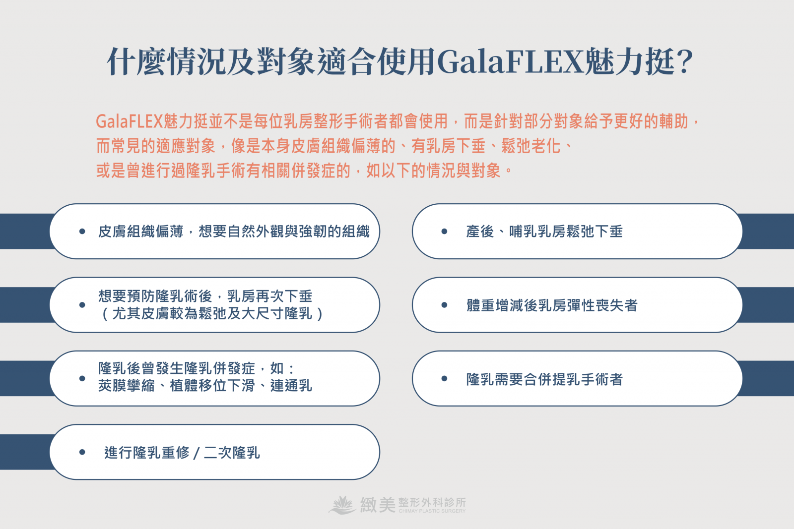 GalaFLEX魅力挺並不是每位乳房整形手術者都會使用,而是針對部分對象給予更好的輔助,而常見的適應對象,像是本身皮膚組織偏薄的、有乳房下垂、鬆弛老化、或是曾進行過隆乳手術有相關併發症的,如以下的情況與對象。
