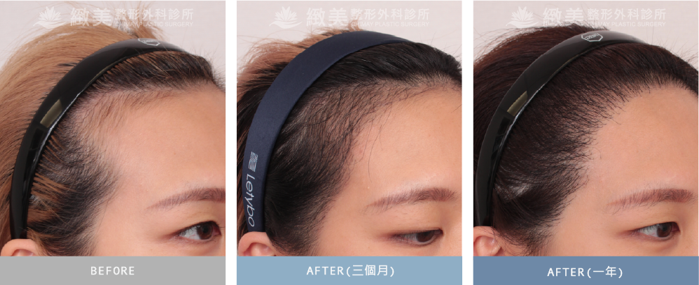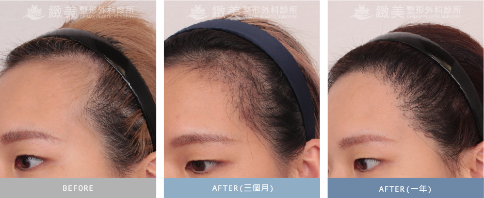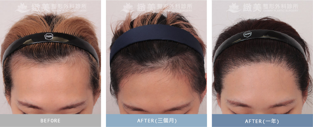 FUE微創植髮手術 - 前額M型禿這位年輕女性,是一位髮型設計師,不過由於前額太高,雖然平時可以用造型修飾,但還是希望可以有更顯著的方式改善外觀,及禿髮問題!因此從後枕部曲髮移植到落髮區,總共種2609根在前額。下方為術前、術後3個月回診、術後1年回診。