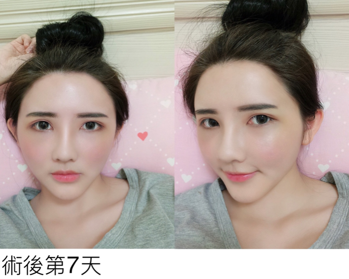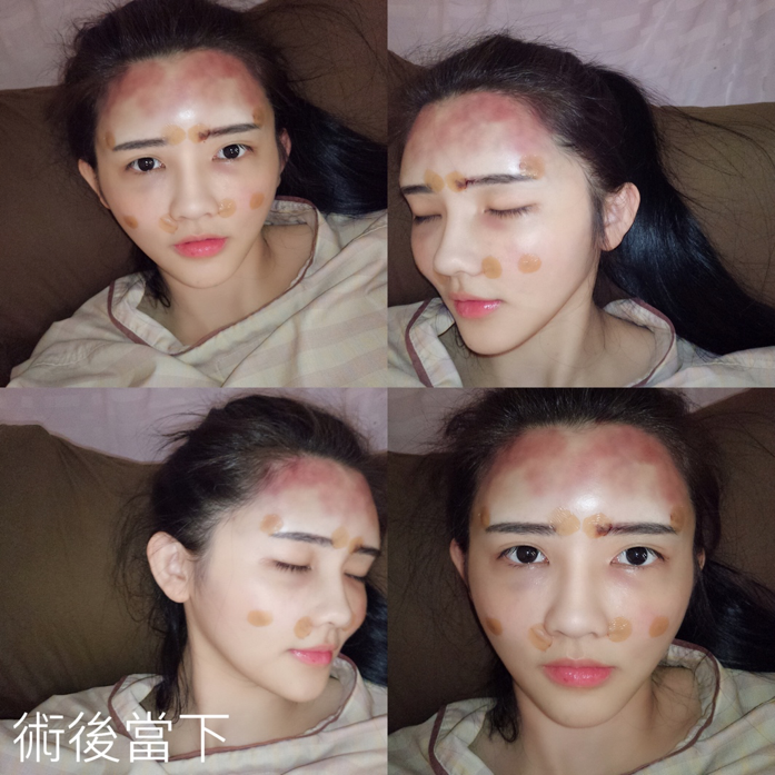 手術結束後當下,額頭跟淚溝有明顯的紅腫瘀青,但是可以看的出來,臉部的線條明顯圓潤很多,凹陷的部分都被補滿了呢!