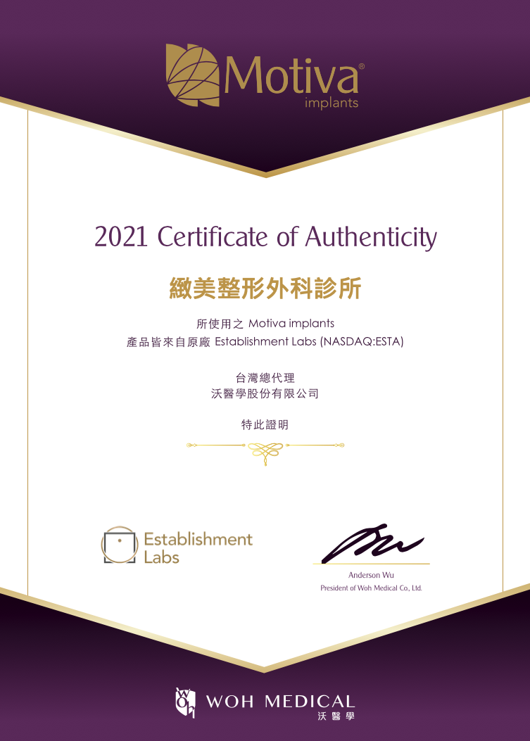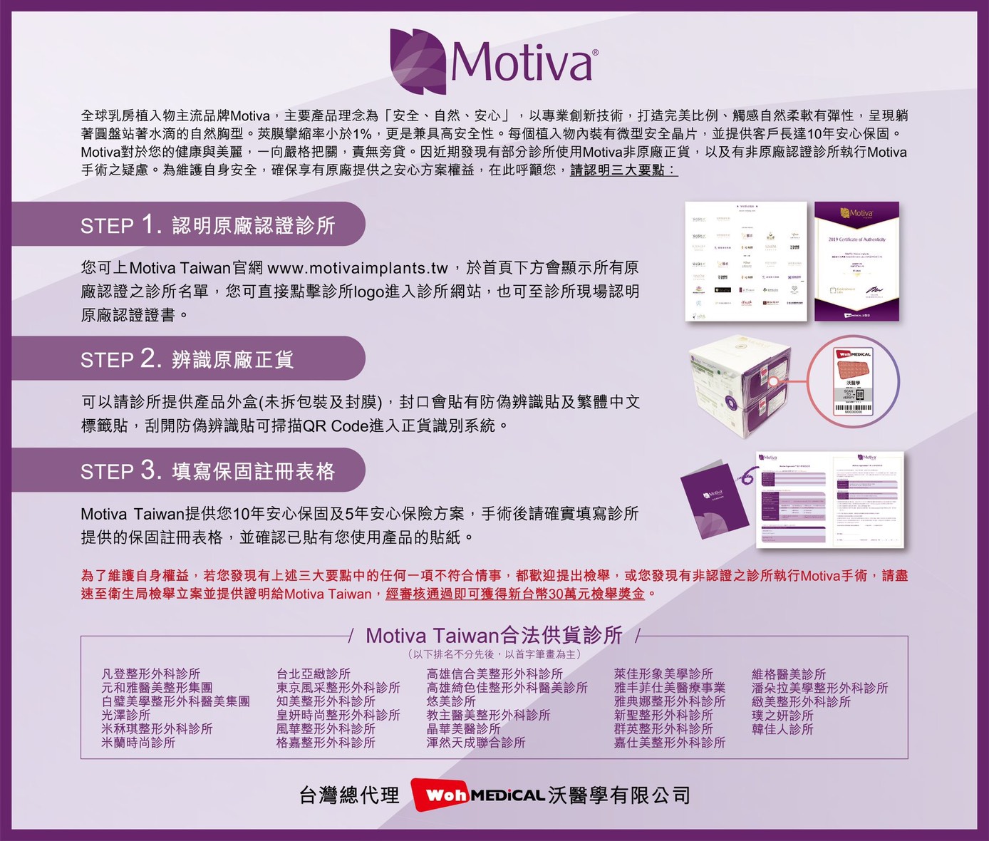 只有在Motiva官方認證的醫療院所進行的魔滴隆乳手術,才能避免使用 非原廠正貨、不明來源之水貨,且安心享有有五年保險及十年保固的保障喔!