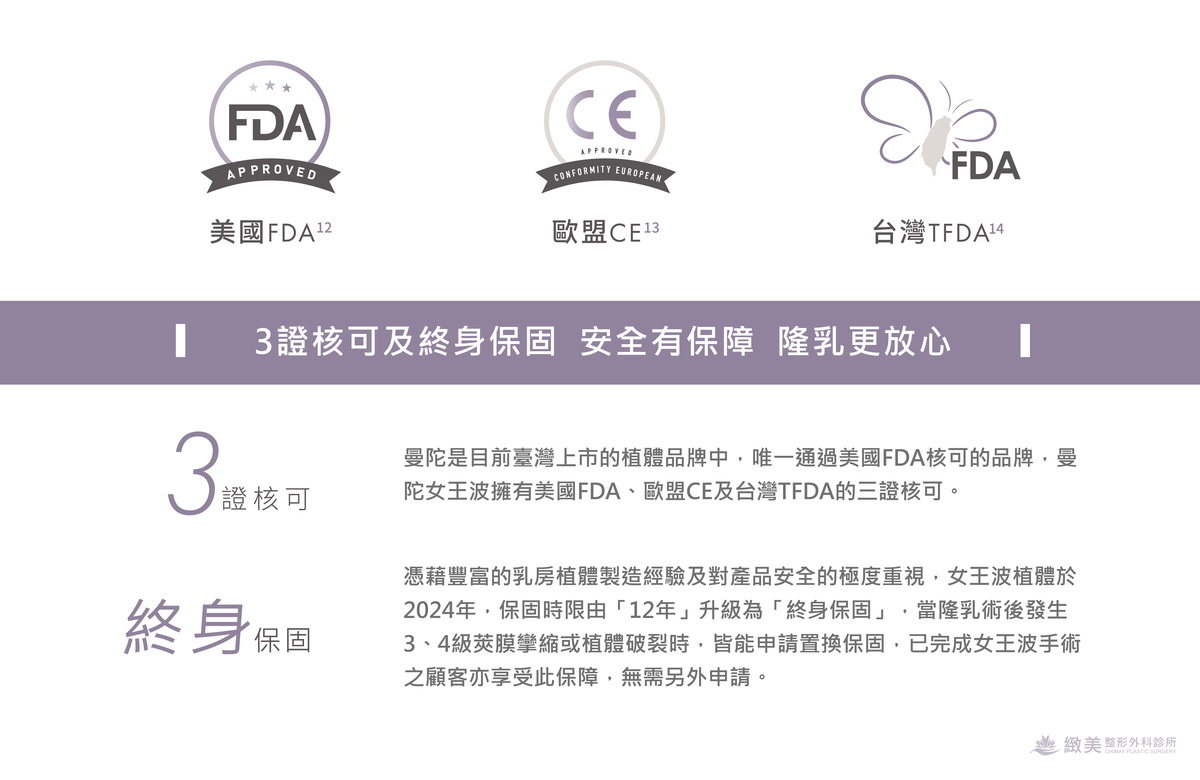 ░ A:曼陀尊貴(Xtra女王波)擁有絕佳的塑形能量,讓植體飽滿但仍維持柔軟,且對於植體安全的極度重視,不但具有美國FDA核可,同時於2024年將植體保固時限由「12年」升級為「終身保固」,當隆乳術後發生3、4級莢膜攣縮或植體破裂時,皆能申請置換保固。