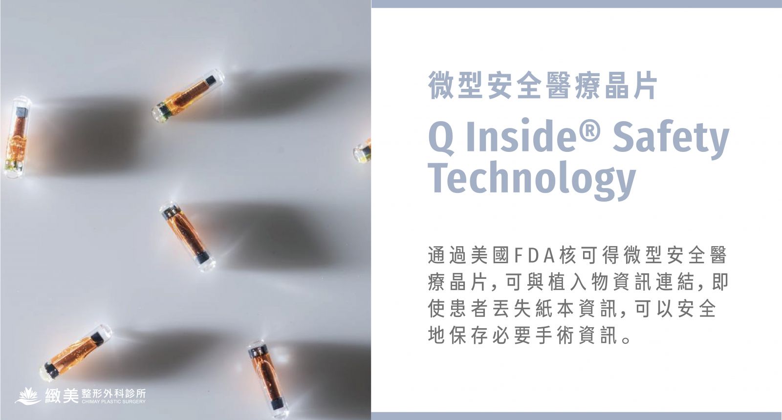 通過美國FDA核可得微型安全醫療晶片,有別於傳統植入物用紙本方式記錄,晶片中會紀錄手術必要的各項資訊,如:植入物資訊、手術資訊、保固保險資訊...等,用更科技的方式保管資料,術後不用擔心資料遺失或遺失保固保險資格。