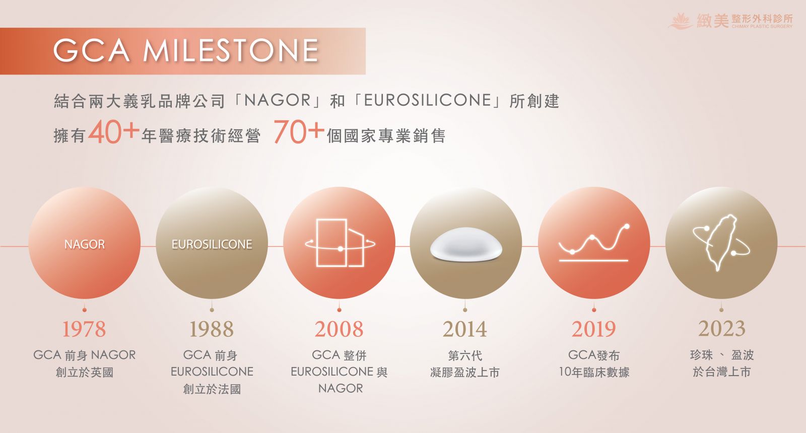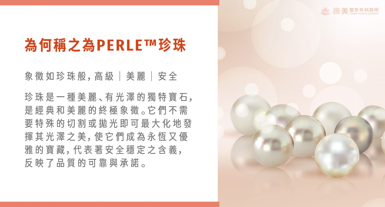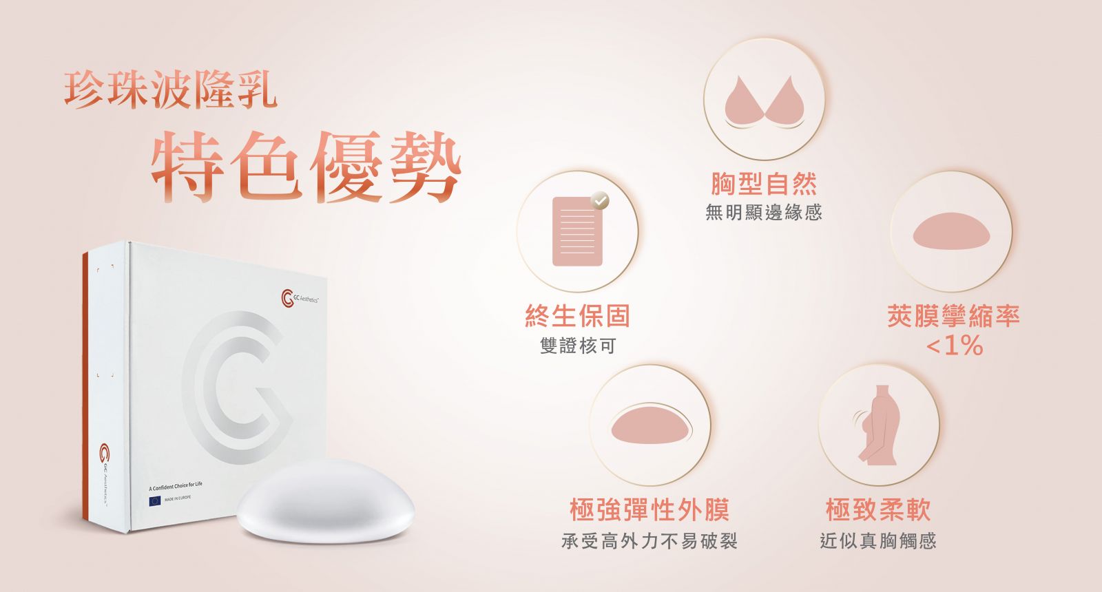 PERLE™ 珍珠波,仿單名稱為「珍珠光滑矽膠義乳」,衛部醫器輸字第032220號,為合法核准之醫療器材。珍珠波由英國醫療技術公司 GC Aesthetics® 所推出,該公司結合 Nagor 與 Eurosilicone 兩大義乳品牌,擁有超過 40 年醫療技術經驗,產品行銷全球超過 70 個國家,並累積超過 300 萬顆植體使用經驗,具備完整的臨床實證與安全紀錄。